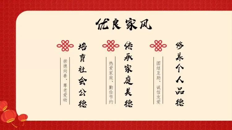 习总书记在会见第一届全国文明家庭代表时指出:尊老爱幼、妻贤夫安,母慈子孝、兄弟友恭,耕读传家、勤俭持家,知书达理、遵纪守法,家和万事兴等都是中华民族传统家庭美德,铭记在中国人的心灵中,融入中国人的血脉中,是支撑中华民族生生不息、薪火相传的重要精神力量,是家庭文明建设的宝贵精神财富。