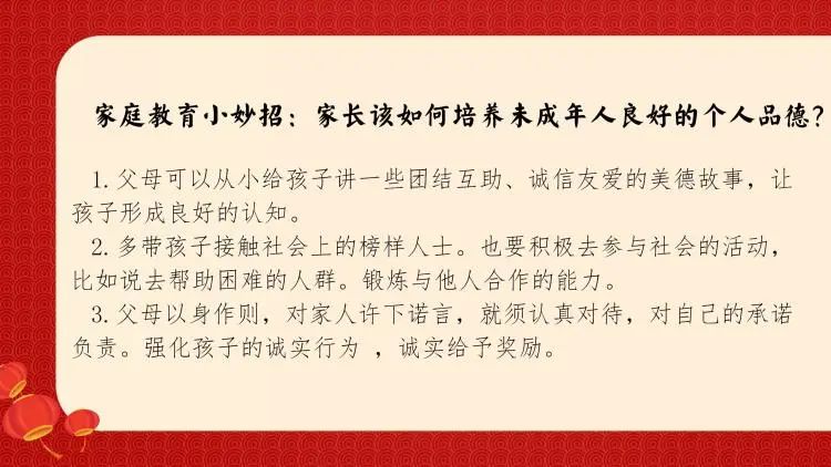 对于家长而言,家长应做一个诚信的人,不对孩子说谎话,做到言而有信,欺骗会给孩子的一生造成不可估量的负面影响。父母要在言行上为孩子树立榜样,以良好的品格来感染孩子、熏陶孩子。古人云:“家风淳,子孙贤”,诚信的家风是形成孩子良好的诚信品质不可缺少的因素。团结互助的好家风也能够激发奋斗动力,汇聚团结合力,对家庭兴旺具有重要作用。