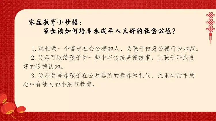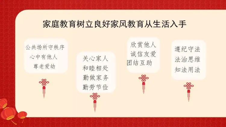大家好!家庭是社会的细胞,以好的家风才能支撑起好的社会风气。每个家庭提升法治意识,才能用法护航家庭幸福。本期的家校驿站将从培育社会公德、传承家庭美德、修养个人品德三个方面和大家聊一聊优良家风这个话题。