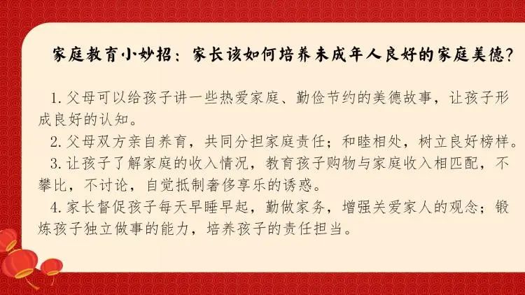 家风连着民风,家事连着国事,家长务必时时牢记使命,在“正好家风、管好家人、处好家事”上下功夫。让我们家长以身作则,培育社会公德、传承家庭美德、修养个人品德。